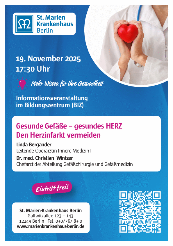 Am 19.11.2025 findet die nächste Informationsveranstaltung Mehr Wissen für Ihre Gesundheit zum Thema Gesunde Gefäße – gesundes HERZ. Den Herzinfarkt vermeiden statt.